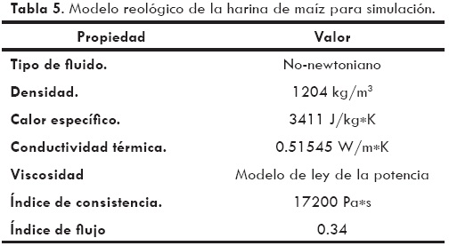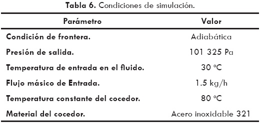 Para poder simular un fluido dentro de un ducto, es necesario crear ese fluido en el software mediante las propiedades termodinámicas y reológicas que se muestran en la Tabla 5. Así mismo, es necesario asignar el tipo de material con el que está hecho el cocedor, en este caso acero inoxidable, y las condiciones de frontera para la simulación como se observan en la Tabla 6.