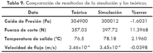 Los resultados se presentan en dos tablas. En la Tabla 7 se muestran solamente los resultados derivados de la transferencia de calor. En la Tabla 8 se muestran los resultados de fuerza de cizalla, presiones y flujos.