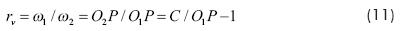 El error cinemático puede ser evaluado por el cambio de la relación de velocidades rv=ω1/ω2. De acuerdo con la ley fundamental del engranaje, la normal a los perfiles de dientes AB (Fig. 4) divide la distancia entre los ejes O1O2 en la relación inversamente proporcional a la relación de velocidades: