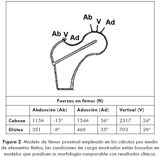Para evaluar los esfuerzos y las deformaciones, se crearon dos modelos basados en la representación geométrica 2D obtenida en la función 1, para su análisis mediante el método de elementos finitos, los cuales se discretizaron con 2221 (sin tornillo) y 4039 (con tornillo) elementos triangulares, con un refinamiento del mallado en la zona de contacto hueso-tornillo, según el diagrama IDEF0 el mecanismo empleado para obtener los niveles de esfuerzo y deformación fue el software CAE Abaqus 6.9® Las condiciones iniciales del modelo de elementos finitos a resolver son las mostradas en la figura 2, basadas en los modelos de Tsubota 2000, Weinans 1992 y Lipperman 2006, que predicen la morfología del fémur considerando dos componentes principales; la reacción que actúa sobre la cabeza del proximal debido al contacto con la cadera y los abductores en tres posiciones, abducción, aducción y en apoyo sobre una pierna, los cuales corresponden a un caso de carga habitual y desfavorable para el fémur.