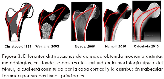 La figura 3 muestra los resultados de los trabajos de varios autores enfocados a la obtención de la densidad, basados en la teoría adaptativa pero utilizando diferentes métodos, tal es el caso del trabajo de Christopher quien la obtiene en forma experimental, Weinans utiliza la teoría adaptativa, Negus introduce un coeficiente de remodelado adaptable con el tiempo y Hambli utiliza optimización con redes neuronales, puede observarse la similitud del comportamiento de la alineación trabecular entre ellas y la calculada para un individuo sano, con ello se asegura que el proceso de remodelado adoptado en este proyecto ofrece resultados similares a los registrados en las referencias, por lo que se considera adecuado para este proyecto.