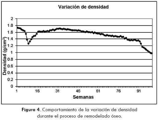 Los resultados del proceso de remodelado óseo se muestran en la figura 4, en donde se observa el comportamiento de la densidad promedio en la superficie de contacto hueso tornillo durante un periodo de cien semanas, se aprecia que la densidad decrece durante las primeras 9 semanas llegando a 1.27 g/cm3, a partir de ese tiempo se incrementa rápidamente hasta la semana 13 registrando 1.58 g/cm3, 90% de la inicial, continuando más lentamente hasta la semana 16.