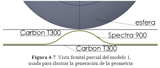 Como ya se mencionó anteriormente, la muestra de referencia fue una placa rectangular de tres capas, la primera de tejido plano de carbón T300, en medio una capa de tejido plano de fibra de Spectra 900® y una última capa de tejido plano de carbón T300. El modelo de elemento inito se muestra en la Figura 5-1.