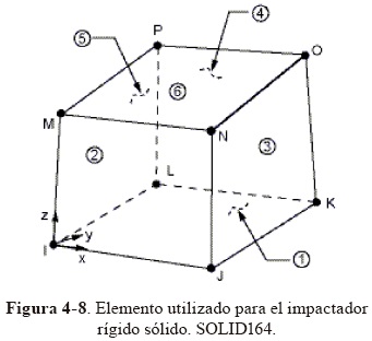 La esfera que impacta fue modelada como una parte rígida usando el elemento SOLID164. Sólo es necesario especificar el modelo de material, en este caso un modelo rígido *MAT RIGID para el cual se especifica la densidad, Módulo de Young y razón de Poisson. Sólo se permite el movimiento del impactador en dirección de la caída de la esfera. El diámetro de la esfera equivale a 0.0254 m (1 in) de diámetro y es de acero. La densidad del acero equivale aproximadamente a 7850