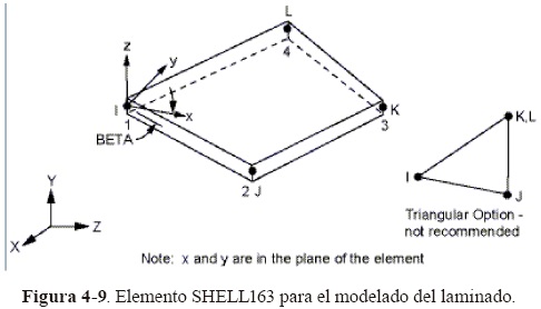 El compuesto se malló con el elemento SHELL163 (Figura 4-9) en forma mapeada. Este elemento es usado para análisis dinámicos y tiene 12 de grados de libertad en cada nodo: translaciones, aceleraciones, velocidades y rotaciones en las direcciones nodales x, y y z. La formulación del elemento usada fue Hughes-Liu (KEYOPT(1)=1), con la opción de elemento Shell activada para materiales compuestos (KEYOPT(3)=1). En el elemento Shell es posible definir sub capas en dirección del espesor, y cada capa de elementos representa una capa del apilamiento del compuesto. Las capas son definidas en ANSYS/LS-DYNA® mediante los puntos de integración. En otras palabras el espesor, ángulo de orientación y el material son definidos para cada punto de integración mediante las constantes reales.