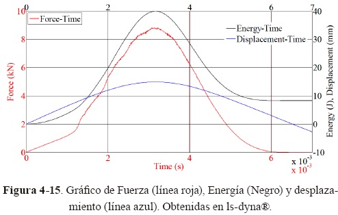 Comparando la Figura 4-13 con la Figura 4-12 se aprecia coincidencia en el comportamiento de los gráficos obtenidos por la simulación y por la literatura. En la Tabla 4-9 se resumen los resultados máximos registrados en ls-dyna® y aquellos publicados en la literatura.