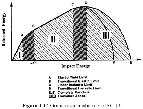 De la IEC se pueden destacar tres zonas. En la zona I se puede decir que el impacto es elástico en su naturaleza con una relación uno a uno entre la energía de impacto y la energía de retor-no. La zona II se caracteriza por una relación lineal entre la energía incidente y la energía de retorno. Esta zona se caracteriza por el comienzo de daño visible pero incipiente que empieza desde el punto B y llega hasta el punto C. Al punto C se le llama límite inelástico lineal.