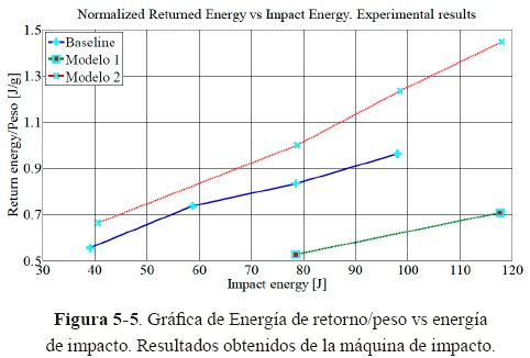 En el caso de la muestra de referencia, el resultado lineal muestra congruencia con los experimentales, además, se observa la misma linealidad para los modelos 1 y 2. De acuerdo con estos resultados, el Modelo 2 mostró una mejor eficiencia en carga de impacto, resultando en un menor daño visible y una mayor energía de retorno. Más aún la relación entre el peso del primer modelo y el modelo de referencia es de 1.7 mientras que para el segundo modelo es igual a 1.01. Lo cual significa que el modelo 1 es 1.7 veces más pesado que la muestra de referencia y el modelo 2 tiene un peso cercano al de la muestra de referencia, tan solo 1.01 veces más pesado.