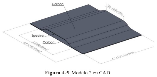 Con el objetivo de tener una muestra para poder comparar los diseños, se elaboró un modelo de referencia, el cual consistió en un panel plano de sección transversal rectangular hecho de una capa de carbón T300 en la parte baja, una capa de Spectra900® en medio y una capa de carbón T300 arriba, con dimensiones ideales de 0.1397 m por 0.1016 m (5.5 in x 4 in). El promedio de las dimensiones y el peso medio de los especímenes se muestran en la Tabla 4-2.