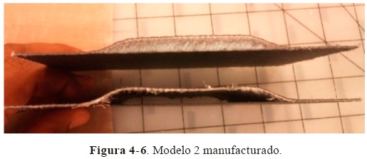 El modelo 2 manufacturado se muestra en la Figura 4-6, en el espécimen en la parte superior, se distingue la espuma usada para darle la forma final al compuesto mientras que en la parte inferior se muestra otro espécimen sin la espuma.