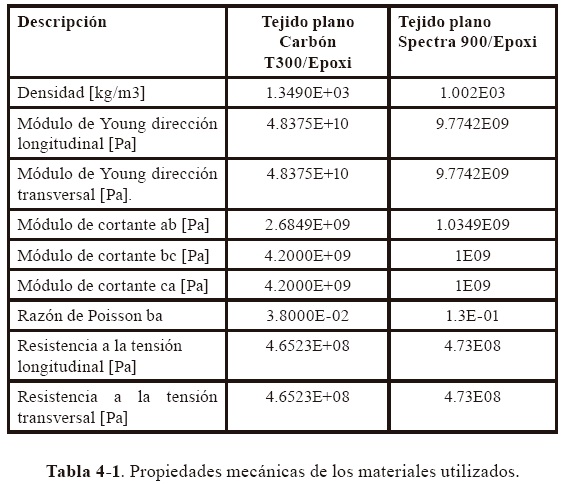 El proceso de manufactura utilizado para la elaboración de todas las muestras fue el llamado Moldeo por Transferencia de Resina Asistido por Vacío (VARTM por sus siglas en inglés). Tomando ventaja de resultados previos obtenidos en [4], se usa una coniguración parecida de materiales, de tal forma que los materiales de refuerzo utilizados fueron un tejido plano de carbón T300 y un tejido plano hecho de ibra de ultra alto peso molecular de polietileno(UHMWPE por sus siglas en inglés). La matriz polimérica fue hecha a partir de la resina/endurecedor Proset 117LV/237. Las propiedades de los materiales compuestos se muestran en la Tabla 4-1