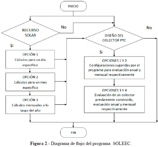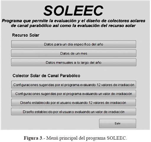 El programa SOLEEC está codificado en una plataforma MATLAB 2009a. Cuenta con una interfaz gráfica que permite al usuario una interacción más manejable y comprensible para la introducción de los datos y la visualización de resultados. Consta de un archivo ejecutable que permite la ejecución del software desde cualquier computadora y su interacción es por medio de interfaces y máscaras que permiten al usuario una comunicación sencilla y una interpretación de resultados simple, ya que para la evaluación del recurso solar muestra gráficas para interpretación de los resultados y para la evaluación térmica del concentrador, muestra tablas de resultados debidamente organizadas.