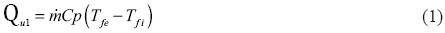 El flujo de calor ganado por el fluido de trabajo que pasa por el concentrador se calcula con la ecuación (1) mientras que el calor entregado por el concentrador solar se representa por la ecuación (2). Finalmente, la ecuación (1) y (2) representan el mismo concepto visto desde el fluido de trabajo y desde la operación del concentrador, respectivamente.