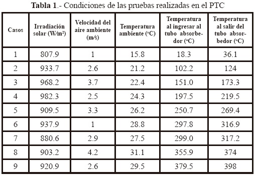 La validación del programa SOLEEC en lo que respecta al diseño del PTC, se llevó a cabo haciendo una comparación entre los resultados que éste entrega y los resultados de un análisis experimental realizado en Sandia National Laboratories y un análisis numérico realizado en el Centro de Investigación en Energía de la UNAM (García-Valladares et al., 2008). El proceso de validación consistió en ejecutar el programa SOLEEC para simular 9 pruebas; la primera utilizando agua como fluido de trabajo y las otras 8 utilizando aceite térmico Syltherm-800, reproduciendo las condiciones descritas en la tabla (1).