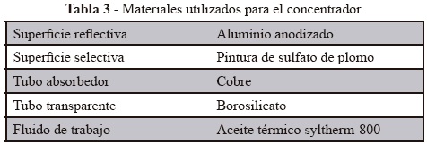 Los datos de irradiación solar que se calcularon en la figura (4) se utilizan en el recuadro de ingreso de datos de la interfaz donde se calculan los parámetros de diseño para el concentrador PTC (figura 5). Los materiales seleccionados para la construcción del concentrador se seleccionan en las opciones que proporciona el software SOLEEC. Para este caso de estudio se seleccionaron los materiales mostrados en la tabla (3). Las condiciones ambientales de la Ciudad de Monterrey y los datos de temperatura del fluido de trabajo al ingresar y al salir del concentrador también deben de ingresarse para iniciar el cómputo de las geometrías y evaluación térmica del concentrador. Si alguno de los datos mostrados falta, no es posible la ejecución del software SOLEEC, ya que todos van ligados en las subrutinas del software y son de gran importancia para el diseño del concentrador.