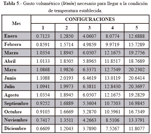 Se observa en la tabla (5), correspondiente a la sección Flujo másico en la interfaz, el aumento en el mismo conforme aumenta el tamaño del concentrador. Esta situación se atribuye a que el calor útil que se obtiene es mayor si el tamaño del concentrador se incrementa y por tanto el fluido requiere menor o mayor tiempo de residencia para alcanzar la tempertura deseada. El gasto volumétrico se modifica para cada valor de irradiación con el fin de garantizar la condición de temperatura del fluido de trabajo requerida y que no ocurra el cambio de fase como se indicó en el proceso de metodología.