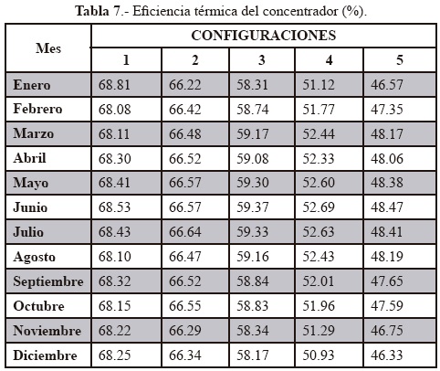 Una vez calculando el flujo de calor útil, la eficiencia térmica del concentrador se determina con la ecuación (8).