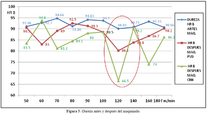 Se puede observar que el comportamiento entre las dos herramientas, en cuanto a los resultados de rugosidad, dureza y temperatura es similar. Se observa un momento de "inestabilidad" que pudiéramos llamar zona crítica, resultado de las diferentes variables en los rangos de velocidad de corte entre 100 a 140 m/min con los dos tipos de herramienta, aunque específicamente es más significativa la variación con la herramienta de CBN ya que se incrementa la temperatura hasta 293°C, la rugosidad llega hasta 8.5 µmm y la dureza baja hasta 66.5 HR B. En cuanto a los resultados con la herramienta de PVD presenta un comportamiento ligeramente mejor con relación a la herramienta de CBN como se puede observar en las diferentes graficas, después de este rango de avance de corte se "estabiliza" y continua la tendencia de cada una de las variables hasta los 180 m/min, donde se incrementa repentinamente, observándose resultados poco favorables en la calidad de la superficie maquinada, se ve una estructura muy homogénea de la matriz, sin cambios aparentes, típicas de la superaleación Inconel 617 esto en la "zona critica inestable".