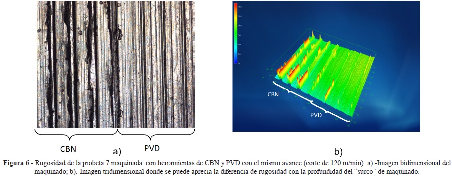 En la Figura 6 se observa la diferencia de rugosidad tridimensional en la barra redonda maquinada con la herramienta de PVD (menor rugosidad) y con la de CBN (mayor rugosidad), debido probablemente a la mayor fuerza de corte ejercida, originada por el desgaste progresivo del inserto de CBN [1], reflejado también en un aumento de temperatura, dicha fuerza no se determinó, podrá valorarse en otro estudio.