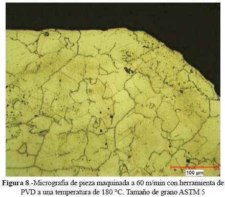 También para una eficiente predicción de la calidad de la superficie maquinada tanto en previo como acabado fino es necesario conocer la maquinabilidad del material y realizar análisis de los cambios de su microestructura. De ahí que en este estudio se realizaron metalografías a las probetas después de maquinadas y se observaron con el Microscopio Electrónico de Barrido (SEM= Scaning Electronic Micros-cope). Como se puede ver en las Figuras de la 7 (8, 9) a la 10 ocurre un cambio de tamaño de grano desde a 4 a 6 de acuerdo a la norma ASTM E112, a medida que la pieza sufre calentamiento durante el maquinado, lo que se explica en función del calentamiento más prolongado que sufren las piezas, requiriendo más tiempo para enfriarse incluso se puede ver que la variación de temperatura y el cambio en el tamaño de grano no son proporcionales al incremento en la velocidad de corte, esto se explica en función del tamaño de rebaba, ya que cuando la misma alcanza un espesor critico, su masa es tal que puede absorber más calor y la temperatura del frente de maquinado tiende a disminuir [7].