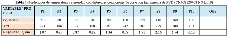 En el maquinado de las 10 probetas de Inconel 617 con velocidades de corte desde 50 hasta 180 m/min en seco, al maquinar cada pieza se midió la temperatura en diferentes puntos; al inicio, en medio y al final de cada pasada, después se calculó el promedio por pieza y se observó un comportamiento similar de variación de temperatura que va desde 99° C hasta 299° C con las dos herramientas de corte utilizadas Tablas 4 y 5. Solo se observa una diferencia significativa de la temperatura promedio de 69.2° C (prácticamente 30° C menos con la herramienta de PVD) como se muestra en la Figura 3, incluso contrario a los que se pudiera suponer, no hay un incremento de temperatura para mayores velocidades de corte.