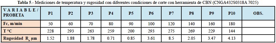Las pruebas se realizaron utilizando dos tipos de insertos con el mismo radio de punta de 0.8 mm, uno de CBN (Sand-vik CNGA432S0318A 7025) y otro de metal duro con recubrimiento de TiAlN por PVD (Lamina Tech CNMG120408 NN LT10) bajo las condiciones de maquinado que se muestran en las Tablas 2 y 3. El maquinado se realizó en seco, al final de cada maquinado se midió la rugosidad.