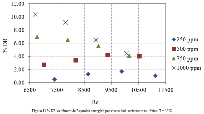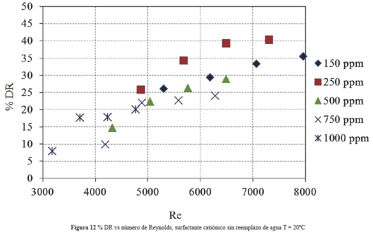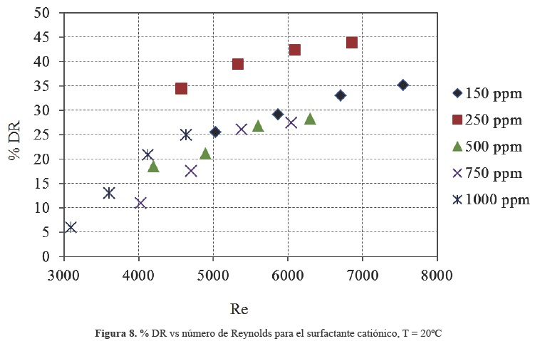 Si estos mismos resultados se grafican pero ahora la reducción de fricción está en función del número de Reynolds corregido, se observa claramente que la mayor reducción de fricción se obtiene con la concentración de 250 ppm del surfactante catiónico. Además, esta reducción de fricción tiene una tendencia a aumentar cuando se incrementa el Reynolds, como se puede ver en la figura 8 (el valor %DR= 0 corresponde al caso donde se tiene sólo agua sin surfactante). Por otro lado, en la figura 9 se grafica la relación de coeficientes de fricción en función de la concentración, tomando como parámetro el número de Reynolds del flujo de agua sin surfactantes. Se observa que efectivamente existe una concentración en la cual se obtiene la mayor reducción de fricción y corresponde a la concentración de 250 ppm y esto se mantiene para cualquier Reynolds, adicionalmente se puede observar que la reducción de fricción aumenta con el número de Reynolds.