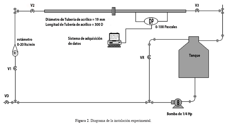 Se diseñó el montaje experimental que se muestra en la figura 2; está formado por un tanque de mezclado con un volumen de 400 litros, una bomba de1/4 de HP, tubería de acrílico de 19 mm de diámetro interior, un rotámetro con rango de 0-20 l/min, y un transductor de presión diferencial con un rango de 0-100 Pa, para medir la caída de presión en el sistema. Tanto el transductor de presión diferencial, como el rotámetro fueron calibrados utilizando los métodos convencionales.