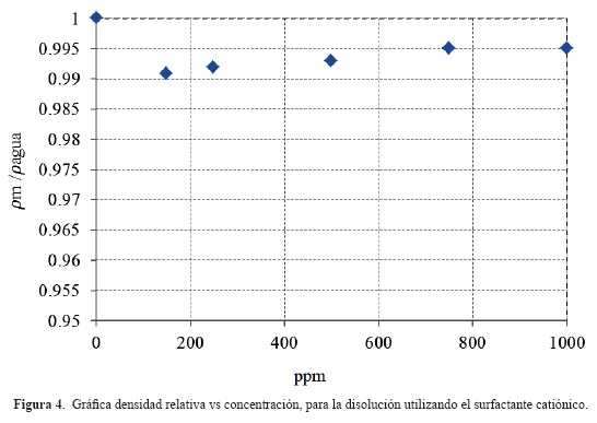 Por otro lado, las propiedades del fluido que afectan a la pérdida de presión, durante la conducción del mismo, son básicamente la densidad y la viscosidad. La primera tuvo una variación menor al 1% al formar una disolución con 150 ppm del surfactante catiónico, a mayores concentraciones, se tiene prácticamente la densidad del agua (figura 4). Por esta razón se puede inferir que la variación de la densidad al agregar surfactantes no es un factor importante para la reducción de la fricción en esta serie de experimentos.
