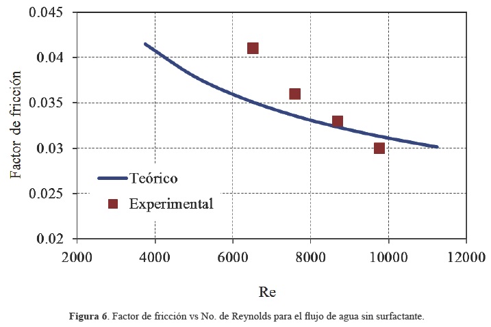 En lo que respecta a las pruebas de referencia, como ya se indicó, la figura 5 muestra los resultados obtenidos para el flujo de agua sin adición de surfactantes, usando los mismos gastos másicos de agua que se utilizaron en las pruebas con los aditivos. Se puede observar que hay una diferencia, entre lo que arroja la teoría usando las ecuaciones (4 y 5) y las mediciones experimentales, sobre todo a bajas velocidades que corresponden a Reynolds menores de 10,000, las diferencias pueden deberse a que la ecuación para calcular el factor de fricción produce errores más grandes en esta zona y sobre todo a que la tubería de acrílico no tiene una sección perfectamente circular, por lo que para realizar la comparación se decidió utilizar las mediciones experimentales. Por otro lado, la figura 6 muestra el factor de fricción calculado utilizando la ecuación (4) y el determinado experimentalmente usando los resultados de las pérdidas de presión. En virtud de que no se conoce con exactitud el estado de la superficie de la tubería que se utilizó en las pruebas, se decidió utilizar los datos que se obtuvieron experimentalmente para comparar los resultados de la pérdida de presión con adición de surfactantes, aunque la rugosidad del acrílico se puede tomar como D/e = 12,670.