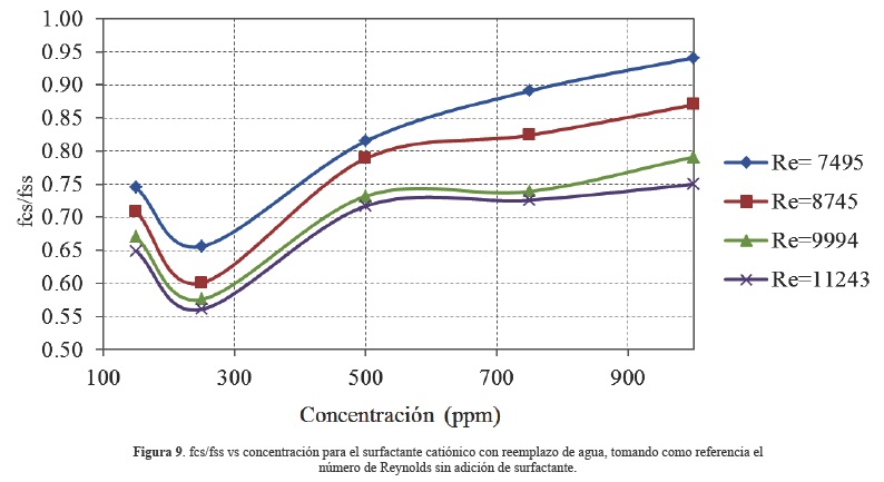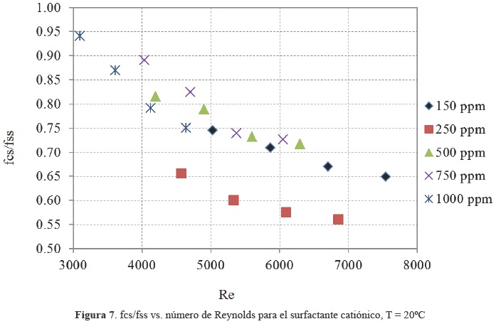 Donde fss es el factor de fricción del flujo de agua sin surfactantes, que en este caso corresponde al que se obtuvo de manera experimental en el experimento (b) y fcs, es el factor de fricción del flujo de agua con surfactantes, que también se obtuvo experimentalmente en los experimentos (c) y (d). La figura 7 muestra la relación que hay entre el factor de fricción experimental usando surfactantes contra el experimental sin surfactantes, para el caso del surfactante catiónico, para diferentes números de Reynolds, calculado y corregido con la viscosidad modificada por la presencia del surfactante y tomando como parámetro la concentración. Se puede observar en la gráfica que cuando se aumenta el número de Reynolds, disminuye la relación entre los factores de fricción, es decir hay mayor reducción de fricción, y esto es más notable con la concentración de 250 ppm. El valor fcs/fss= 1 corresponde al caso donde se tiene un flujo de agua sin surfactante.