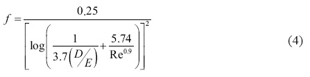 El coeficiente de fricción se determinó utilizando la ecuación desarrollada por P. K. Swarmee y A. K. Jain (1976), que proporciona ± 1.0 % de los valores que arroja la ecuación de Colebrook, dentro del intervalo de rugosidad relativa de D/e, comprendido entre 1,000 y 106, y para números de Reynolds que van de 5,000 hasta 1x108. Lo cual es la zona de turbulencia completa en el diagrama de Moody. En este estudio con el diámetro de 0.019 m y una rugosidad del acrílico de 0.0000015 m se tiene D/e = 12,670, por lo que es aplicable la ecuación.