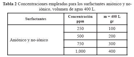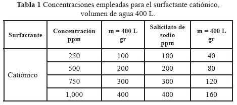 Los surfactantes catiónicos se pueden preparar en agua, solamente si se estabilizan agregándoles una substancia, ya que su falta de afinidad por el agua provoca que se separen rápidamente de ella. La estabilización de estos surfactantes se realiza por medio de la adición de iones, los cuales al absorberse pueden interactuar con el agua y de esta manera estabilizan el surfactante. La mutua repulsión entre las partículas del surfactante con los iones adsorbidos de la misma carga evita que las partículas choquen y aumenten su tamaño, como lo indica Moore (2000). Para estabilizar el surfactante catiónico se agregó salicilato de sodio. Las tablas 1 y 2 muestran las concentraciones que se utilizaron en las disoluciones con los surfactantes catiónico, aniónico y no-iónico. De igual forma que en todos los experimentos realizados en este trabajo, se efectuaron tres repeticiones por cada corrida con el fin de verificar que no hubiese desviaciones mayores al 5%.