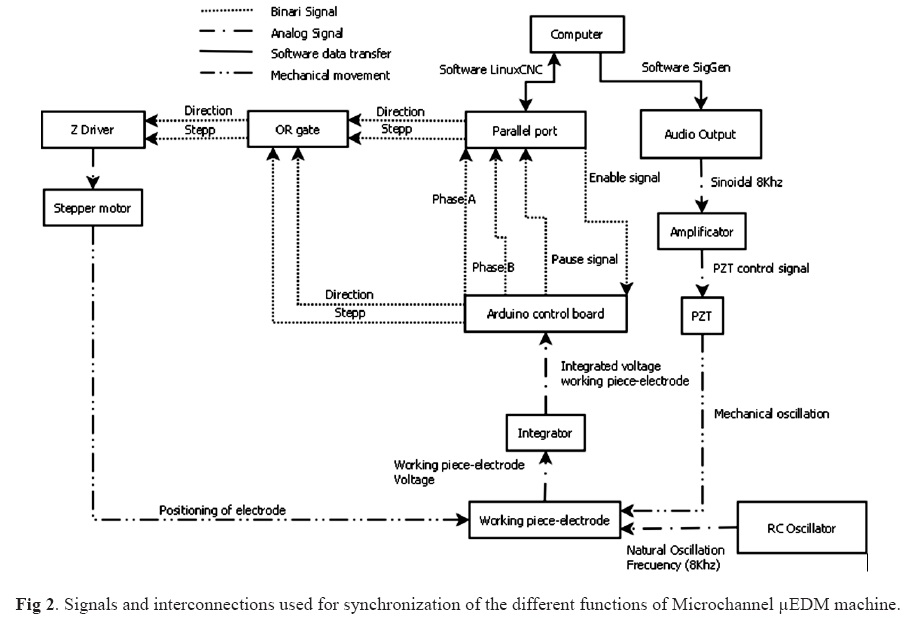 Commercial µEDM machines are controlled by special software designed specifically for the process. In general, conventional control software for CNC machines are not capable of retraction of the axis for the purposes of gap control. However, LinuxCNC can be modified by the user to fit the needs of the process, which made it suitable for the purposes of this work. The parallel port of a computer was used for the interaction of LinuxCNC with the different modules of the machine (see Figure 2). The signals for step and direction of each axis were taken from this port.