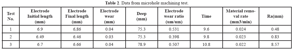 The data collected from three consecutive tests is shown in Table 2. The average material removal rate was calculated to be 0.0231 mm3/min, with a roughness Ra of 0.62 µm, electrode wear ratio of 0.47 µm/µm and depth of 76.5 µm.