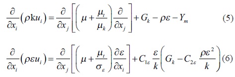 La turbulencia es un factor importante a considerar en un modelo numérico de esta naturaleza, por ello que en el código computacional se seleccionó un modelo de turbulencia de tipo k-ε estándar. Este tipo de modelo de turbulencia es frecuentemente usado para aplicaciones industriales debido a su robustez numérica y al amplio rango de flujos turbulentos que logra modelar. Para ello, se supone numéricamente que los términos del esfuerzo de Reynolds se relacionan con gradientes de velocidad promedio usando una viscosidad de turbulencia promedio. El modelo k-ε resuelve dos ecuaciones de transporte, una para la energía cinética turbulenta k y otra para la velocidad de disipación, ε: