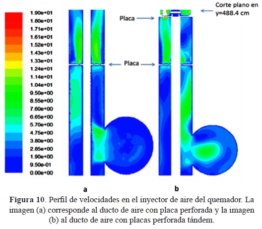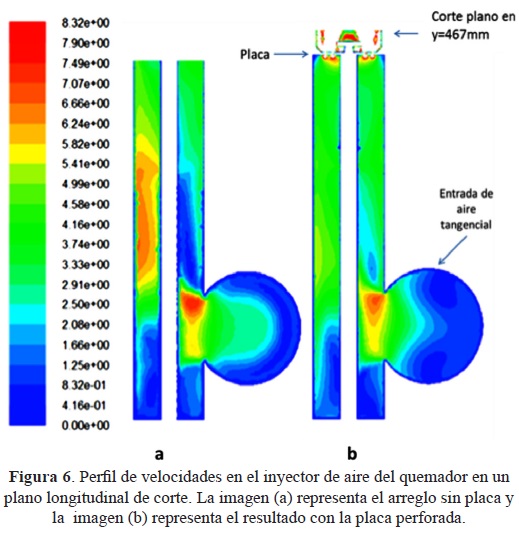 El resultado de la simulación numérica muestra una comparación de la distribución de velocidades a lo largo del plano vertical del quemador sin la placa y con la placa perforada (ver figura 6), la velocidad máxima alcanzada en el ducto de aire para los dos casos es 8.32m/s. El perfil de velocidades en el ducto de aire para la simulación del caso sin la placa presenta un comportamiento no uniforme, se detectan regiones velocidades de 1lm/s a 7 m/s. En la entrada tangencial de aire en el ducto la velocidad máxima es de 8.3m/s. Se observa que en el caso del modelo sin la placa el perfil de velocidades es uniforme en el ducto de aire a partir de y=300 mm y totalmente uniforme en y=425 mm. En el caso de la placa perforada, la velocidad máxima en el ducto de aire es de 7 m/s en la entrada tangencial de aire. Este efecto permite deducir que la placa perforada origina la desaparición de regiones con velocidades bajas o altas, logrando que el flujo se desarrolle uniforme a lo largo del conducto de inyección de aire.