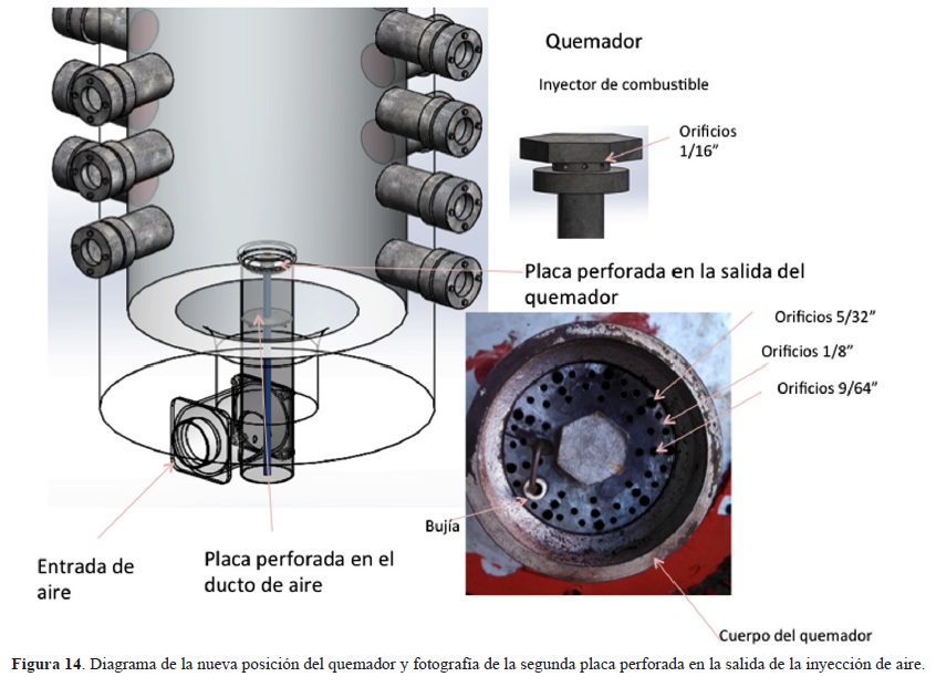 Para la optimización de la inyección de aire se han realizado diversos estudios, por ejemplo se ha caracterizado la flama de un quemador utilizando diferentes configuraciones de una placa de inyección de aire perforada (Dong,2011). En este caso se probaron diferentes diámetros, distribución y distancia de los orificios de la placa y ésta fue colocada en la inyección de aire. Los resultados indican que en todos los casos se obtenía una flama azul (quemado completo), excepto cuando se tenia el caso con las perforaciones de mayor diámetro que generaba una mezcla rica en combustible produciendo una región postflama amarilla (quemado incompleto). La placa con las perforaciones de menor diámetro fue la de mejor flama producida alcanzando la mayor temperatura y mejor estabilidad.