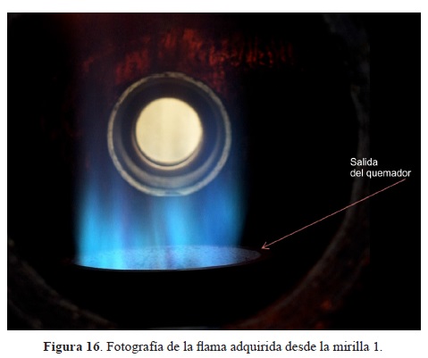 El análisis de la forma y estabilidad de la flama se realizó de forma visual desde las cinco mirillas. Si la flama se encuentra alineada, en un corte longitudinal debería de verse los contornos de la flama verticales, tal como efectivamente se observo durante las pruebas en la mirilla 1 (ver figura 15). El comportamiento simétrico y la base anclada de la flama en la salida del quemador permitieron que esta no presentara en ningún momento de la prueba problemas de extinción. Por otro lado el color azul claro representa la zona de mezclado y el color azul oscuro representa la zona de reacción. La base de la flama ligeramente se despega del lado derecho de la salida del quemador debido a la región de baja velocidad como bien predijo el resultado del modelo numérico (ver figura 11). El comportamiento de los valores de la temperatura de la flama (ver figura 15) a 4 cm del eje central de la cámara de combustión es una característica de la disminución del diámetro de los orificios en la placa perforada localizada en la salida del quemador (ver figura 9); más allá del punto de temperatura máxima los valores de temperatura decrecen más rápido para un diámetro menor de orificios (Dong, 2011).