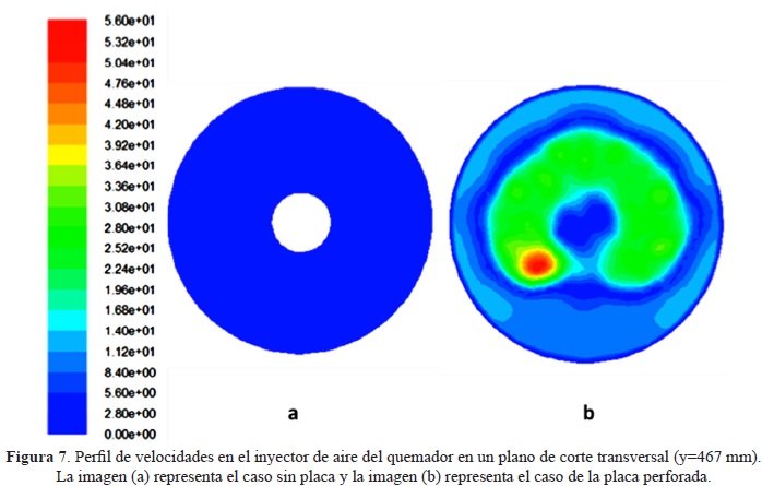 Al estudiar el plano transversal localizado a 467 mm por debajo de la salida de aire del inyector (ver figura 7), se detecta que el caso sin la placa la velocidad del flujo de aire es de 5.4m/s y para el caso de la placa alcanza 56 m/s. Sin embargo, el comportamiento del flujo de aire para el caso sin placa es uniforme en la salida y caso contrario para el caso con la placa que genera una región de alta velocidad en los orificios de 9/64" con una región de alta velocidad concentrada (orificio 1/4") cerca del inyector de combustible. Se puede concluir que el resultado de este perfil de velocidades es el precursor del desalineamiento de la flama.