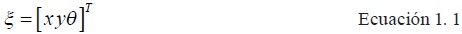 Donde, la coordenada (x, y) describe la posición del punto P con respecto al sistema inercial {x,y} y donde θ=θp, es la orientación del manipulador, medida desde el sistema absoluto al sistema local Además, es el vector postura de velocidades del vector. Sea, el vector postura de velocidades del vector, expresado en el sistema local, entonces: