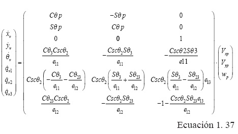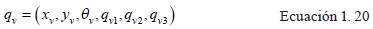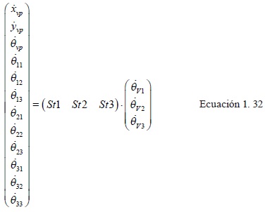 Se emplea la Ecuación 1.5 hasta llegar a la Ecuación 1.15 para obtener la representación en variables de estado del manipulador 3RRR-(RRR)v que se resuelve en función de las vari.ables de la cadena virtual (RRR)v. Las salidas son (xv, yv,θv