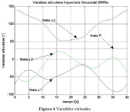 El la Fig. 6 se muestran las gráficas de la evolución de las coordenadas generalizadas de la cadena virtual en el seguimiento de una trayectoria.