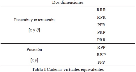 Una vez conocidas el número de variables con las que se puede controlar al sistema, se pueden utilizar alguna de las cadenas virtuales seriales definidas en la síntesis de tipo [20] o definir las propias. La Tabla I y la Fig. 2 muestra cadenas virtuales que están formadas por juntas rotacionales y prismáticas de 3GDL.