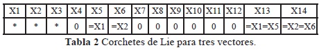 Si existe una solución para k1,...,kn, entonces el corchete de Lie es linealmente dependiente. Se realiza el método hasta que no queda ningún par de vectores columna por probar y termina el proceso iterativo de los corchetes de Lie. Una base para el álgebra de Lie, propuesta por [25] para tres vectores generada por g1, g2, g3 es: