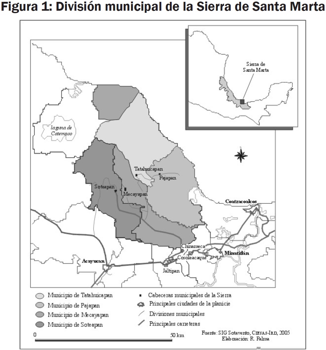 A la luz de estos eventos, este texto se articula en torno a dos preguntas centrales: ¿cómo se construyó la "ciudadanía agraria" posrevolucionaria en una región indígena del Istmo veracruzano? y ¿en qué medida esta "ciudadanía agraria" fue fortalecida o trastocada con los cambios al artículo 27 y la ejecución de la nueva ley agraria mediante el PROCEDE? La reflexión sobre estos dos puntos parte de un estudio etnográfico y de archivo realizado en los ejidos Soteapan y Tatahuicapan. Ambos ejidos se ubican en las localidades que fungen como cabeceras de los municipios que responden al mismo nombre de los ejidos mencionados, aunque su trasfondo histórico es muy diferente. Soteapan es un poblado de origen prehispánico que ha fungido como pueblo cabecera desde la colonia, en tanto que Tatahuicapan fue un pueblo sujeto a Mecayapan hasta 1997, cuando la legislatura local aprobó su conformación como municipio libre, al cual se integraron localidades que anteriormente pertenecían a los municipios de Soteapan y Mecayapan. Estos dos municipios, junto con los de Tatahuicapan y Pajapan, ocupan el total de la superficie de un espacio natural particular: la Sierra de Santa Marta (ver figura 1). Dicha Sierra es uno de los dos conjuntos montañosos que irrumpen en la llanura costera del sur de Veracruz, colindando al norte y al oriente con el Golfo de México.