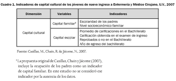 We present a case study of social representations on their profession, have incoming young people to careers in nursing and Surgeon of the Universidad Veracruzana (UV). My hypothesis is that the social origin of students contributes to shaping the professional expectations and anticipations and therefore your choice of career. The aim is to establish whether the set of information, beliefs, opinions and attitudes of young people who chose to race, are associated with the volumes and types of cultural capital. In this case, the choice of career be explained from a socio-cultural dimension, linked to opportunity structures. Youth is characterized by volume of cultural capital and establish statistical associations between it and built a typology of social representations. The results allow to distinguish types of representations between the university, which are being confronted with their cultural capital and their chosen career.