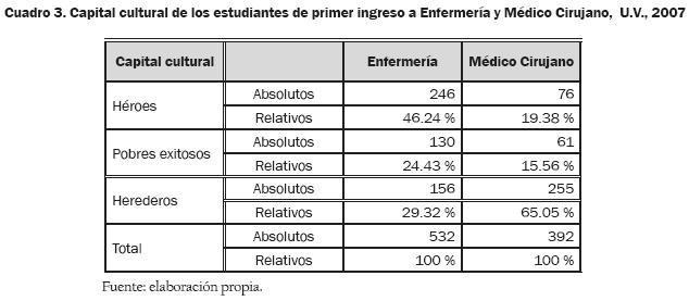El 70% de los jóvenes que ingresaron a Enfermería en el año 2007 son de capital cultural muy pobre (Héroes) o pobre (Exitosos), mientras que 65% de quienes ingresaron a Médico Cirujano tienen un capital cultural alto (Herederos) (ver cuadro 3).