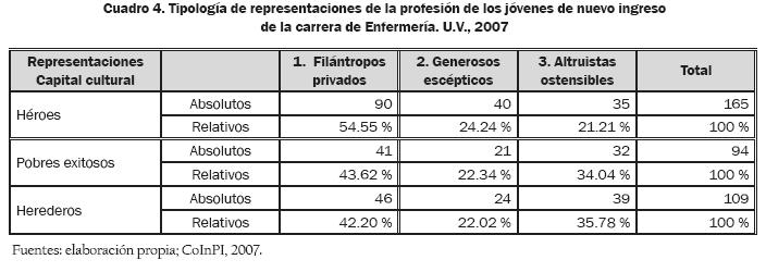 Al analizar la asociación entre capital cultural y las tipologías de representaciones, por carreras, encontramos los datos presentados en el cuadro 4. De acuerdo con éstos, sostenemos que un típico joven de nuevo ingreso a la carrera de Enfermería, tiene una representación filantrópica de la profesión basada en la ayuda que se brinda al otro y al mejoramiento de la sociedad. Niegan los beneficios económicos, cuestionan la posibilidad de una movilidad económica, pero reconocen la posibilidad de un aumento del status social de la familia y niegan el reconocimiento social de la profesión. Son mayoritariamente filántropos privados, pues recordemos que los héroes predominan entre quienes ingresaron a la carrera de Enfermería en el año 2007 (ver cuadro 4).