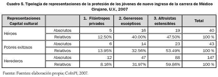 El cuadro 5 presenta los datos del cruce entre capital cultural y representaciones en los estudiantes de nuevo ingreso de Medicina. Un típico joven héroe de esta carrera tiene una imagen altruista, ligada con ciertos beneficios económicos y la posibilidad de un ascenso económico y social, y reconoce en ella su status y prestigio (altruistas ostensibles). O bien, comparten una imagen generosa que niega los beneficios económicos y la movilidad social y económica ascendente. No obstante, reconoce el status y el prestigio de la profesión (generosos escépticos). Recordemos nuevamente que los herederos son el grupo de estudiantes de nuevo ingreso que predomina en el año 2007 (ver cuadro 5).